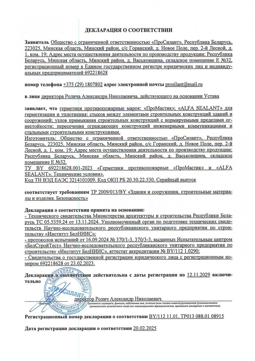 Герметик ALFA SEALANT характеризуется огнестойкостью, газонепроницаемостью и дымонепроницаемостью. Так, под воздействием высоких температуры данный материал расширяется в объеме, в результате чего возникает надежный противопожарный барьер. За счет этого обеспечивается высокий уровень герметизации узлов сопряжения строительных конструкций и, как следствие, их предел огнестойкости.